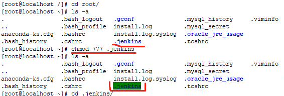6.进入root之后先查看是否有.jenkins文件,有的话先给.jenkins赋权限用 chmod 777 .jenkins