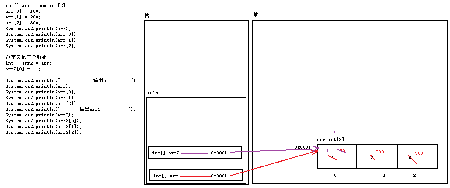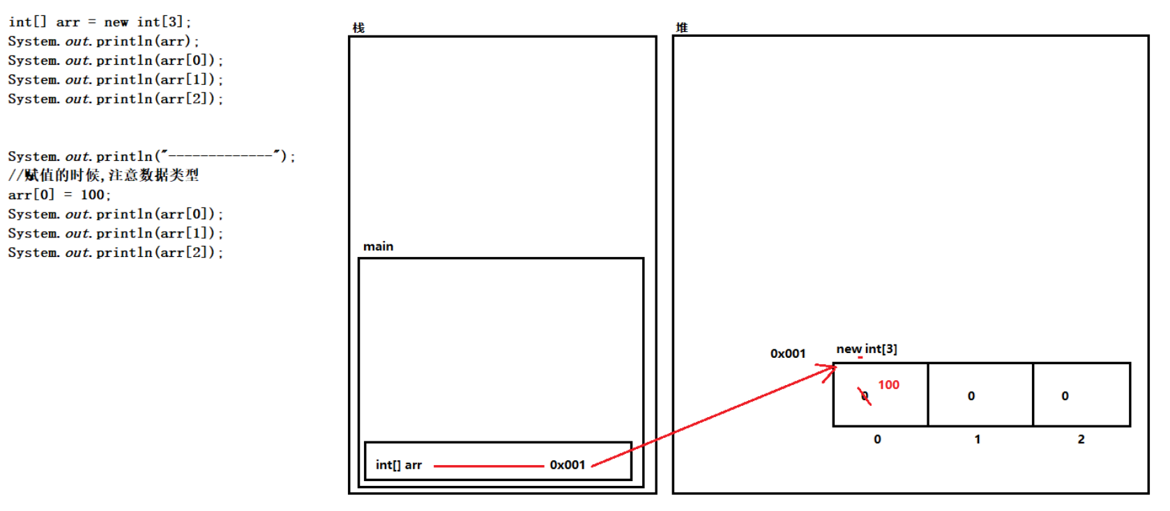 package com.shujia.day03.ketang; /* 数组:是一个存储多个元素的容器, 是一块连续的内存空间,每一个位置都有索引进行标识 特点: 同一个数组中,只能存储同一种数据类型的元素. 数组的定义: 语句定义格式: 数据类型[] 数组名; 数组光定义出来不能直接使用,需要对数组进行初始化 两种初始化的方式: 1. 动态初始化: 初始化时只指定数组长度,由系统为数组分配初始值。 2. 静态初始化: 初始化时指定每个数组元素的初始值,由系统决定数组长度。 动态初始化: 语句定义格式: 数据类型[] 数组名 = new 数据类型[元素的个数]; 举例:创建一个可以存储3个int类型的数组 int[] arr = new int[3]; 局部变量: 方法上或者方法内部定义的变量统称为局部变量,在栈中出现 */ public class ArrayDemo1 { public static void main(String[] args) { //定义一个存储int类型元素的数组 // int[] arr; // System.out.println(arr); /** * * 左边: * int: 表示该数组中的元素都是int类型 * []: 表示该数组是一个一维数组 * arr: 是数组的名字,符合标识符命名规则 * * 右边: * new: 在堆内存中开辟空间 * int: 表示该数组中的元素都是int类型 * []: 表示该数组是一个一维数组 * 3: 表示的是该数组可以存储3个元素 * */ // int[] arr = new int[3]; int[] arr = new int[3]; System.out.println(arr); //[I@4554617c //实际中,更需要获取数组中的元素值 //java中提供了获取元素的方式,数组中每一个元素都有一个位置下标索引,可以通过索引获取对应位置上的元素 //语句格式: 数组名[下标索引] 索引从左向右,从0开始 int a = arr[0]; System.out.println(a); int a2 = arr[1]; System.out.println(a2); int a3 = arr[2]; System.out.println(a3); } public static void sum(int a,int b){ } }
