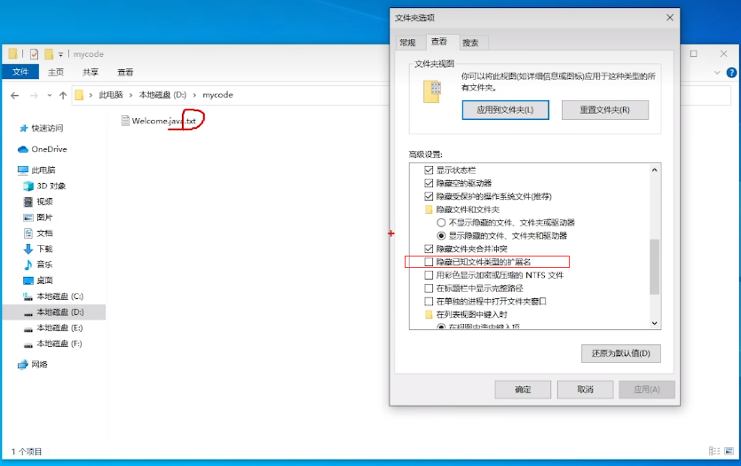 2.然后,新建一个TXT格式的文档,名字可以起Welcome.java (这里注意一点要看清文件的后缀名,起名字之前在“文件夹选项”中,找到“隐藏已知文件类型的扩展名”把前面的√去掉。否则会显示TXT类型而不是JAVA类型。)如图我这里是错误的名字,需要去掉.txt,回车,系统会提示是否改变类型,选择“是”即可。