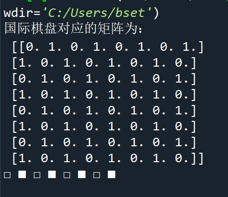 import numpy as np matr1=np.ones((8,8)) for i in range(8): for j in range(8): if(i+j)%2==0: matr1[i,j]=0 print('国际棋盘对应的矩阵为:\n',matr1) for i in range(0,8): for j in range(0,8): if matr1[i,j]==0: print("□",end=' ') else: print("■", end=' ') print('\n')