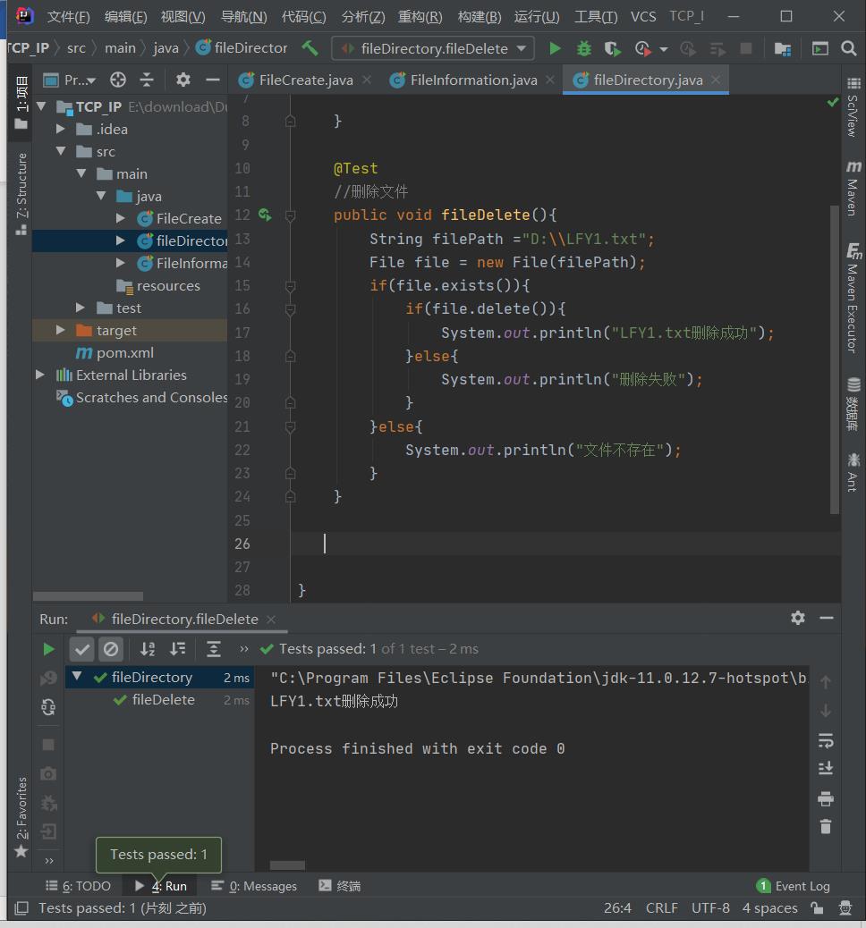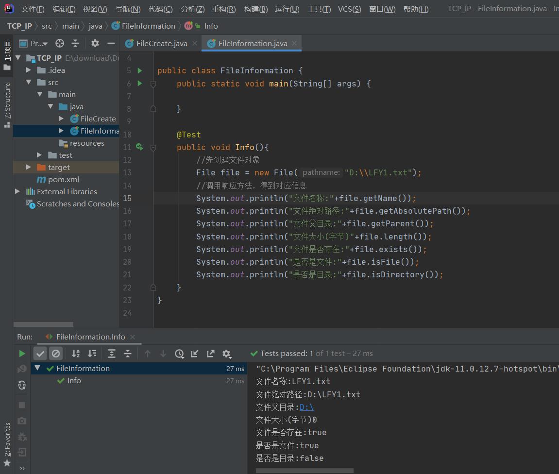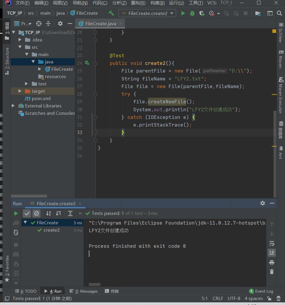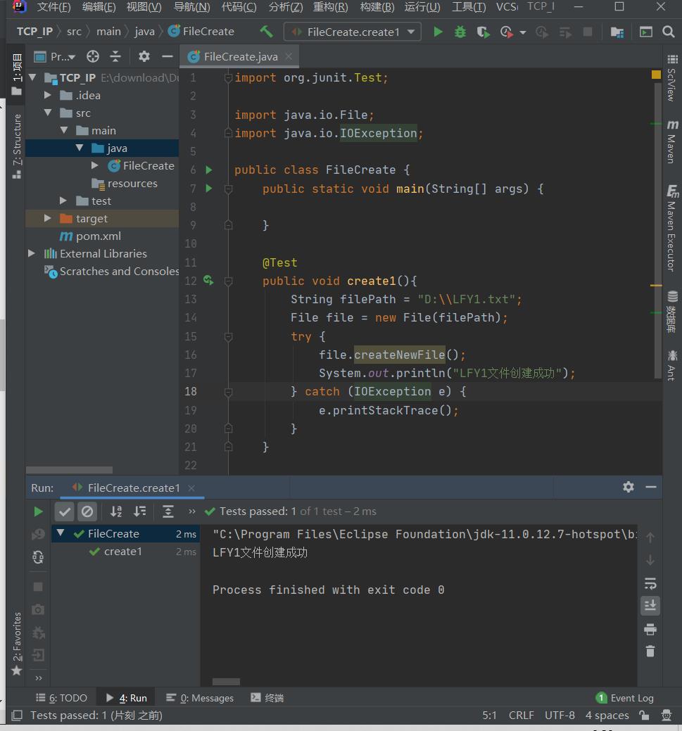 (1)通过路径直接构建一个文件对象(此处的Test是要添加Junit依赖),结果是根据传入的绝对路径(案例为D盘下创建LFY.txt),来创建文件,如果存在同名文件不会报错。