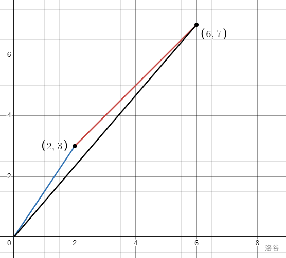 例如:(2,3)+(4,4) 表示从原点到 (2,3),再以 (2,3) 为原点到 (4,4),相当于直接到了点 (6,7)。所以 (2,3)+(4,4)=(2+4,3+4)=(6,7)