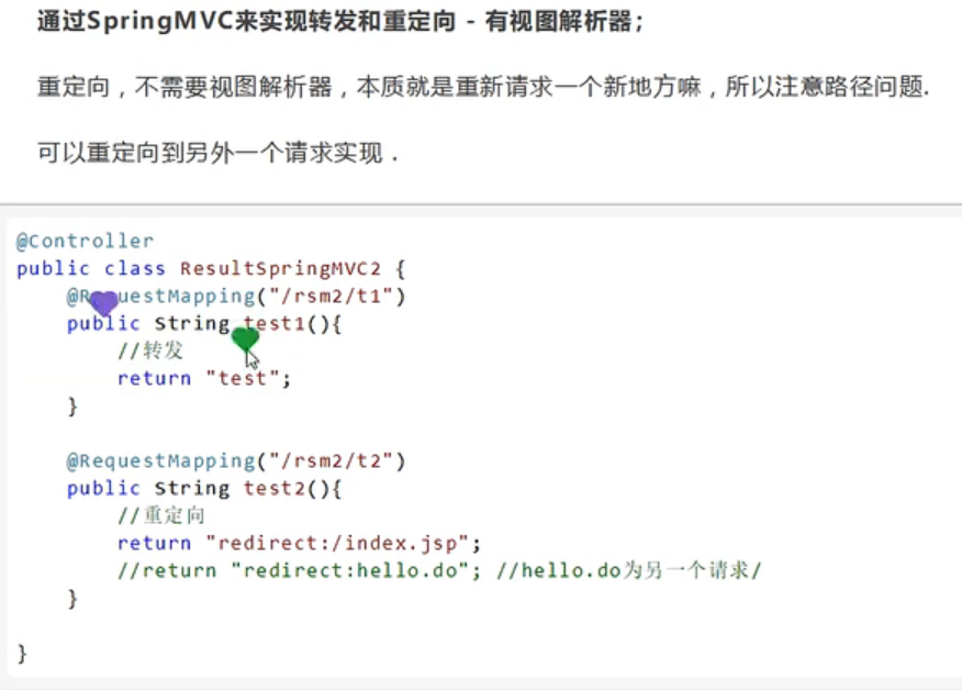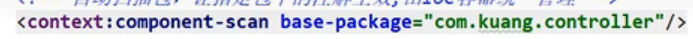 自动扫描包,该路径下的注解生效由IOC容器统一管理。在Controller包下的类中加@Controller注解代表这个类将会被Spring接管。被这个注解的类中所有的方法,如果返回值类型为String,就会被视图解析器解析。