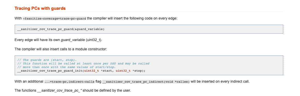 工程中配置使用它-fsanitized-coverage=trace-pc-guard,编译器会在每个代码边缘插入以下代码: __sanitizer_cov_trace_pc_guard(&guard_variable)。