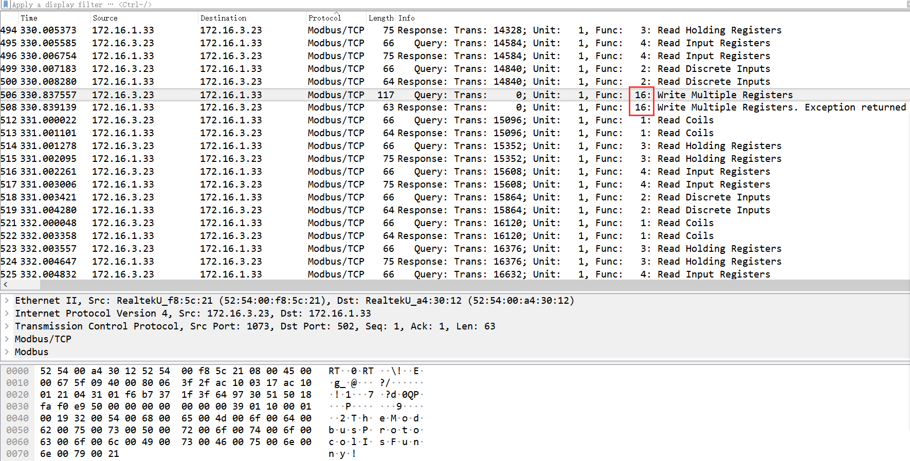 分析协议功能吗1234四个功能码出现多次,而功能码16只出现两次,可能存在异常