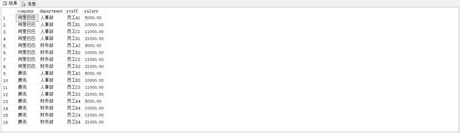 insert into t_rank values ('阿里巴巴','人事部','员工A1','5000');