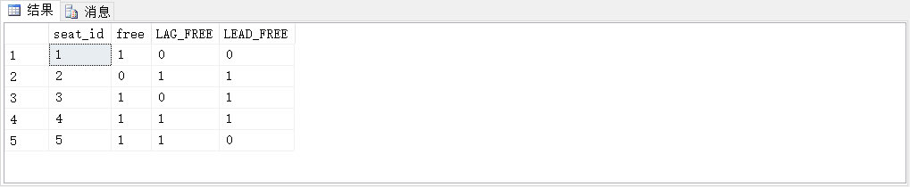 SELECT SEAT_ID FROM (SELECT *, LAG(FREE,1,0)OVER(ORDER BY SEAT_ID) AS LAG_FREE, LEAD(FREE,1,0)OVER(ORDER BY SEAT_ID) AS LEAD_FREE FROM T0527 )T WHERE FREE = 1 AND (FREE = LAG_FREE OR FREE = LEAD_FREE)