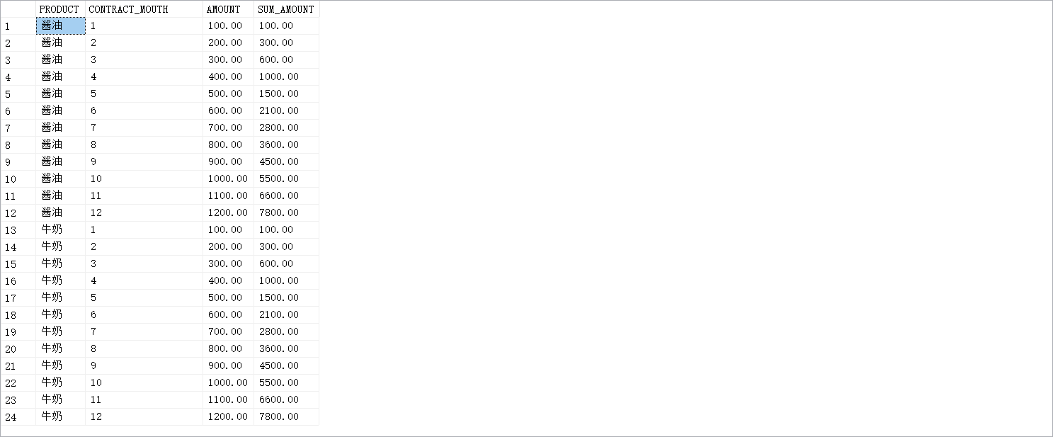 需求:有如下示例数据,其中PRODUCT表示产品,CONTRACT_MOUTH表示合同月份,AMOUNT表示当月合同金额,请求出每个产品累计合同金额。