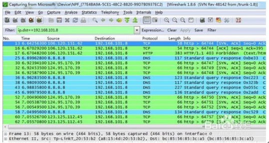 (1)过滤源ip、目的ip。在wireshark的过滤规则框Filter中输入过滤条件。如查找目的地址为192.168.101.8的包,ip.dst==192.168.101.8;查找源地址为ip.src==1.1.1.1;
