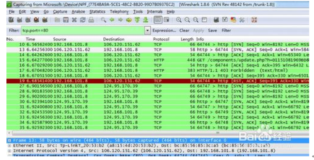 (2)端口过滤。如过滤80端口,在Filter中输入,tcp.port==80,这条规则是把源端口和目的端口为80的都过滤出来。使用tcp.dstport==80只过滤目的端口为80的,tcp.srcport==80只过滤源端口为80的包;