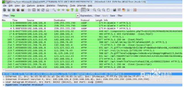 (3)协议过滤比较简单,直接在Filter框中直接输入协议名即可,如过滤HTTP的协议;