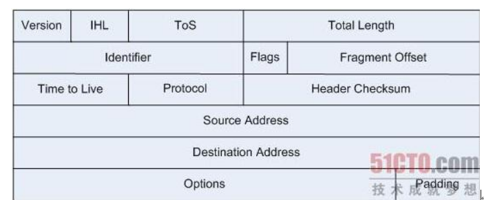 注:标识(Identification)、标志(Flags)、片偏移(Fragment Offset)这3个字段与IP报文的传输有关。IP数据报是网络层的数据单元,它需要被封装在第二层的数据帧中来传输。互联网是由各种二层规范不同的网络互联起来的产物,这些不同的网络的帧格式及帧长度各不相同。例如,以太网的帧和令牌环的帧在结构和长度上都不相同。IP数据报在某个二层网络中能够被完全封装,到另一个二层网络中就未必可以。因此,IP数据报有可能被分割,称为"分片(Fragmenting)",当数据到达目的地时还要对分片进行重组。上述3个字段正是用于对分片和重组进行控制的。