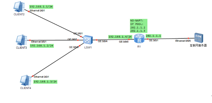 ① R1的G0/0/0端口开启Proxy ARP功能:[Huawei-GigabitEthernet0/0/1]arp-proxy enable