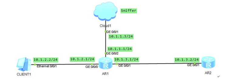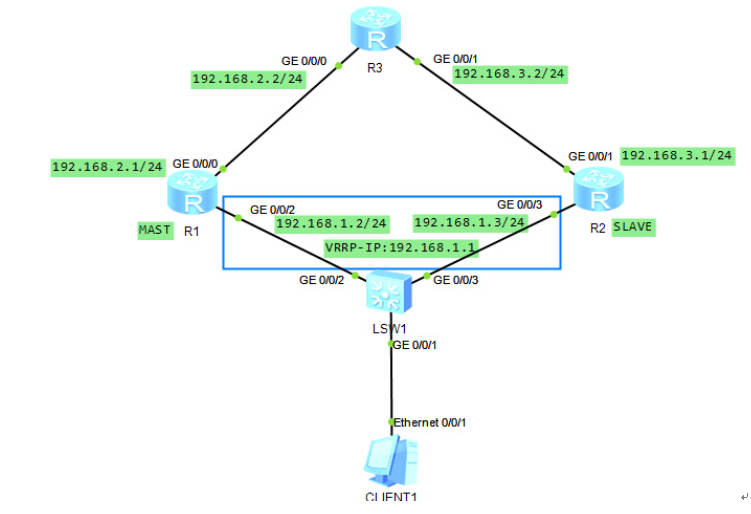 CLIENT1想要访问目标CLIENT2,根据自己的IP和子网掩码与运算得出192.168.2.2与自己处于不同网段,此时发送ARP请求直接请求网关192.168.1.1的MAC地址,R1收到ARP请求后,将192.168.1.1端口的MAC地址回复给CLENT1。