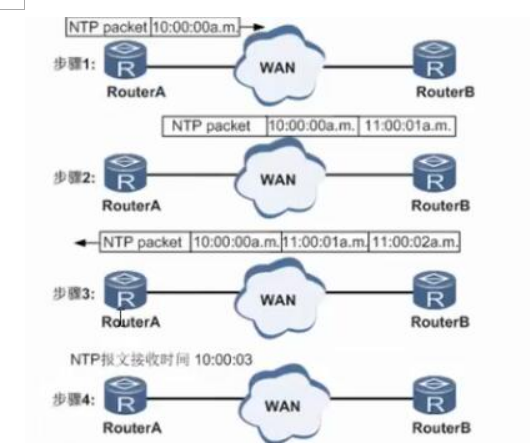 Router A根据计算得到Delay为2S,Offset为1小时,Router A根据这些信息来设定自己的时钟,实现与Router B的时钟同步