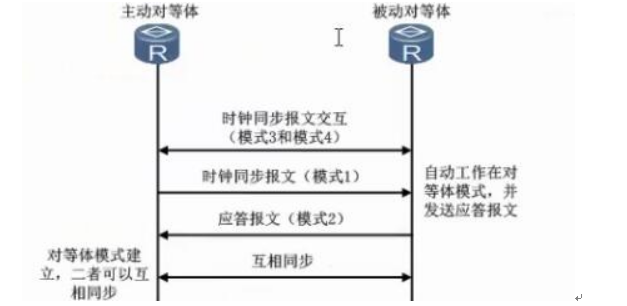 ①主动对等体:运行在这一模式下的主机定期发送报文,报文中的Mode字段设置为1(主动对等体)。不考虑它的对等体是否可达以及对等体的层数。运行在这一模式下的主机可以向对方提供同步信息,也可以依照对方的时间信息通步本地时钟。