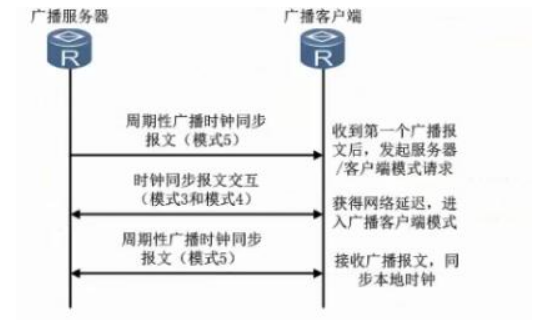 广播模式应用在有多台工作站、不需要很高的准确度的告诉网络。典型的情况是网络中的一台或多台时间服务器定期向工作站发送广播报文,广播报文在毫秒级的延迟基础上确定时间。