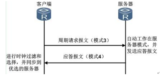 这种模式下,主动对等体会发起Mode字段为3(客户端模式)NTP报文,由被
