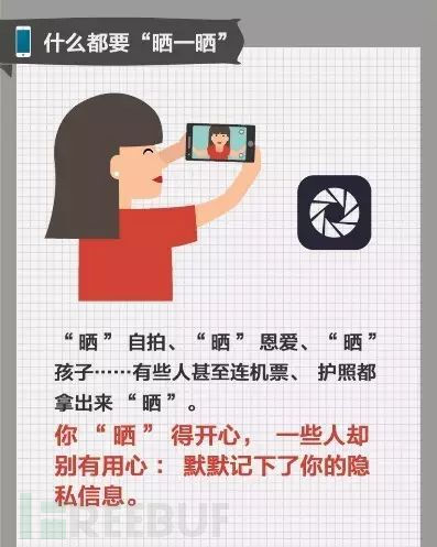 应对方法● 不要晒火车票、机票、登机牌等,机票和火车票的条形码或二维码含有乘客的个人信息;● 不要晒护照、家门钥匙、车牌、位置,这些会透露你特定时间所处的特定位置,也会透露你的生活圈;● 不要晒孩子照片及姓名,爱晒孩子的父母们,不妨限制一个分享范围;● 不要晒家中老人照片,老人容易上当受骗。