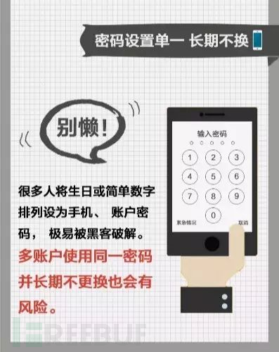 《公众网络安全意识调查报告(2015)》显示,75.93%的网民存在多账号使用同一密码的问题,44.42%的网民使用生日、电话号码或姓名全拼设置密码,17.05%的网民从不更换密码。