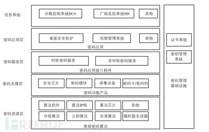 火电厂电力监控系统密码技术应用框架 密码资源层:为火电厂电力监控系统提供基础性的密码算法资源,包括底层的分组算法、公钥算法、杂凑算法、随机数生成算法等以及上层算法软件、算法IP核、算法芯片等对底层基础算法的封装且基础算法采用国家商用密码算法。 密码支撑层:提供发电领域密码应用的基础密码模块/设备,包括基于安全芯片、采集设备、现场测量设备、密码卡/机等各类业务密码设备。 密码服务层:为火电厂电力监控系统提供密码应用接口服务,包括为应用系统提供数据的机密性保护功能的对称密码服务;为应用系统提供身份认证、数据完整性保护功能的公钥密码服务。 应用系统层:调用密码服务层提供的密码应用程序接口,实现所需的数据加解密、数字签名验证等功能。电力监控系统:包括分散控制系统DCS、厂级监控系统SIS等。 密码基础管理设施:作为火电厂电力监控系统中相对独立和基础的组件,为密码资源层、密码支撑层、密码服务层和应用系统层提供密钥管理。