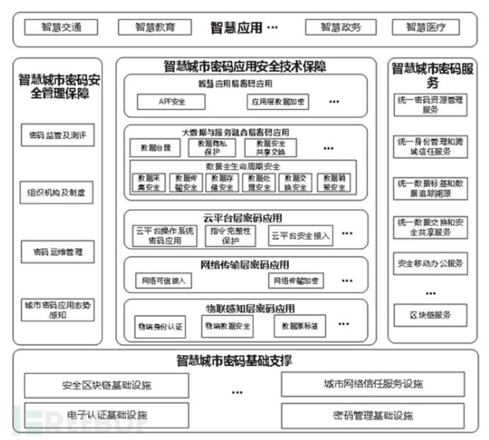 智慧城市综合运用物联网、云计算和大数据等新技术,全面整合城市信息化资源,围绕智慧城市建设的全方位、多层次、多维度安全保障需求,主要从“统”“保”“服”“管”支撑智慧城市的密码应用保障工作。