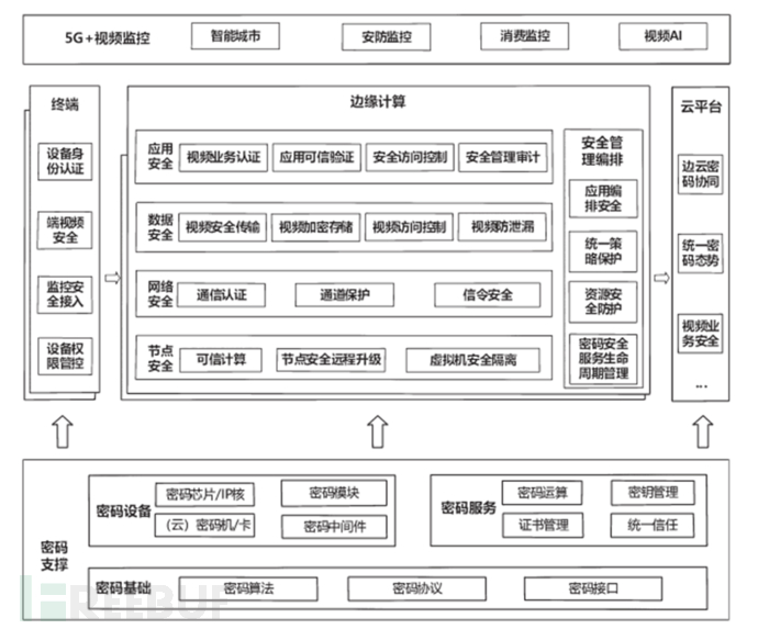 基于5G边缘计算的视频监控密码应用框架 密码应用框架以密码基础、密码设备、密码服务为支撑,在视频监控终端、边缘计算平台、云平台实施密码安全防护,有力保障5G视频监控在智能城市、安防监控、消费监控、视频AI等领域的安全应用。 密码支撑涵盖密码基础、密码设备、密码服务三个方面。 密码基础指的是国家密码管理机构批准核实的密码算法、密码协议、密码接口,即基于国产商用密码的算法、协议及接口。 密码设备为部署在终端、边缘、云端的密码产品,包括密码芯片、IP核、密码模块、(云)密码机、(云)密码卡、密码中间件等。 密码服务指的是密码运算、密钥管理、证书管理、统一信任等安全服务。终端密码应用指的是为摄像头、IoT监控设备等提供的设备身份认证、端视频安全、监控安全接入、设备权限管控等密码能力。 边缘计算密码应用包括节点安全、网络安全、数据安全、应用安全、安全管理编排等方面的密码应用。云平台密码应用包括边云密码协同、统一密码态势、视频业务安全等方面的密码应用。