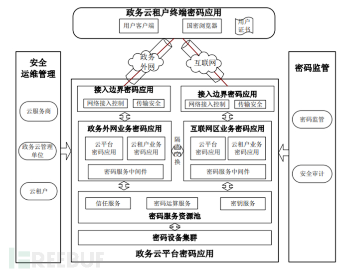 政务云密码应用技术架构 政务云租户终端密码应用指互联网租户终端和政务外网租户终端,负责为政务云用户提供各类业务应用操作功能; 政务云管道指政务云租户终端与政务云平台之间的安全传输管道,承载租户终端用户到云平台间业务数据的传输保护; 政务云平台密码应用指政务云平台上承载实现的各类密码应用服务,包括接入区边界密码应用、政务外网业务区密码应用和互联网业务区密码应用,通过密码设备集群和密码服务资源池为云平台自身和各云租户单位业务应用提供各类密码服务资源;密码监管指在密码主管部门设立密码监管平台,负责对政务云平台使用的密码设备进行密码监管与安全审计;安全运维管理是指通过云服务提供商、政务云管理单位和云租户三方角色划分与协同工作,保障政务云整体安全防护能力。
