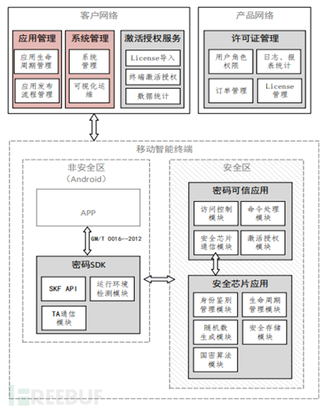 - 移动端密码模块(二级):提供签名验签、加密解密、杂凑等密码运算服务,同时提供一定的存储空间,用于存放数字证书。