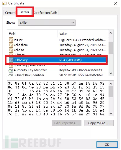 如果不知道自己现有证书的密钥长度,可通过以下几个简单的操作步骤就可以查看。例如,在Windows中找到您的证书文件,右键单击证书,选择【属性】,点击证书的【详细信息】选项卡,在【公钥】里即可查看到密钥长度,如下图:
