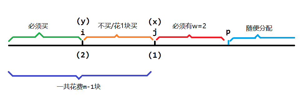 其中 \(p\) 为最靠左的 \(p\) 满足 \(a_p<a_i-a_j\)。可以分成:\([1,i-1]\) 中的物品一定被购买(因为 \(j\) 是第一个被创飞的,之前的钱数一定足够,因此 \([1,i-1]\) 中的物品一定在贪心时被购买 ),\(i\) 作为二类物品,\([i+1,j-1]\) 可以选择一类物品购买,而 \((j,p)\) 必须全是二类物品,否则可以从其中选择一个一类物品和 \(j\) 一起结合,得到的 \(a_j+a_k>a_i\),进而弥补掉 \(i\) 的损失,这是不合法的,因此 \((j,p)\) 一定全是二类物品,而 \(p\) 之后可以随便。
