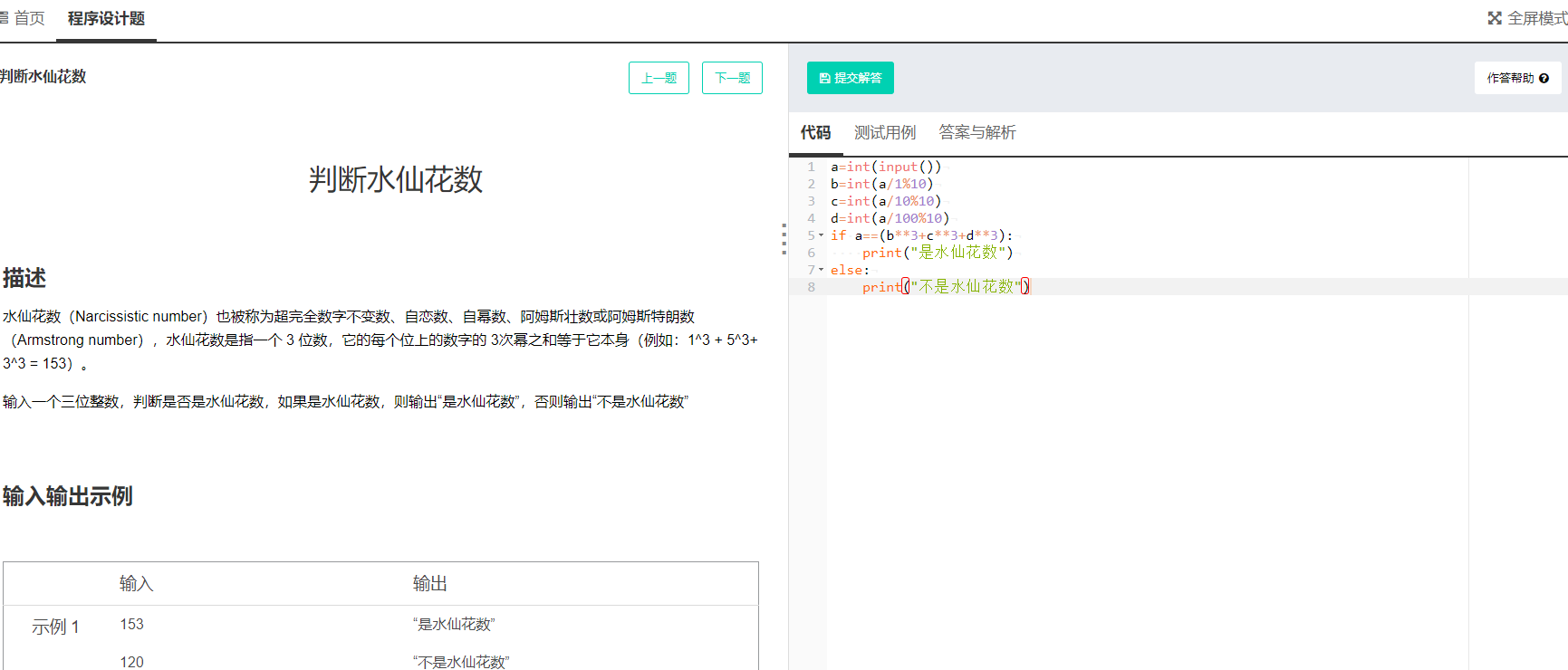 设计循环程序,输入一个三位整数,判断是否是水仙花数,如果是水仙花数,则输出“是水仙花数”,否则输出“不是水仙花数”