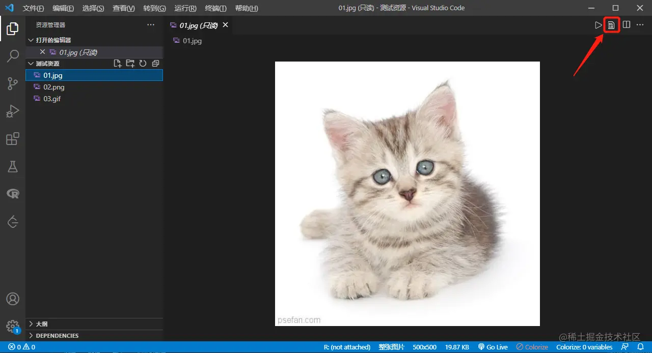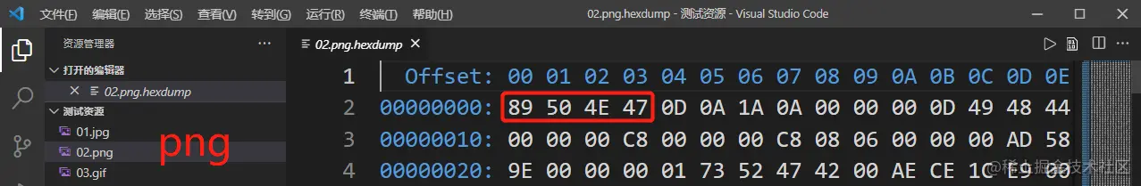所有文件在计算机中都是以二进制形式进行存储的,但二进制数据是不方便做判断的,我们可以利用 vscode 插件hexdump for VSCode以十六进制的形式查看二进制文件。安装完成后,点击右上角的小图标,即可查看文件的十六进制信息: