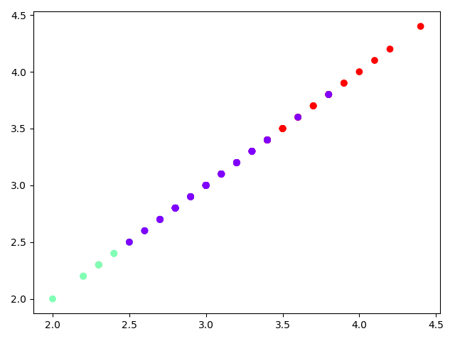 import matplotlib.pyplot as plt from sklearn.cluster import KMeans from sklearn.datasets import load_iris iris=load_iris() data=iris.data[:,1] x=data.reshape(-1,1) y=KMeans(n_clusters=3) y.fit(x) y_pre=y.predict(x) plt.scatter(x[:,0],x[:,0],c=y_pre,s=50,cmap='rainbow') plt.show()