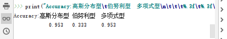 from sklearn.datasets import load_iris from sklearn.naive_bayes import GaussianNB from sklearn.model_selection import cross_val_score from sklearn.naive_bayes import BernoulliNB from sklearn.naive_bayes import MultinomialNB iris=load_iris()#数据集 gnb=GaussianNB()#高斯分布型 bnb=BernoulliNB()#伯努利型 mnb=MultinomialNB()#多项式型 #对各模型进行交叉验证 g_scores=cross_val_score(gnb,iris.data,iris.target,cv=10) b_scores=cross_val_score(bnb,iris.data,iris.target,cv=10) m_scores=cross_val_score(mnb,iris.data,iris.target,cv=10) print("Accuracy:高斯分布型\t伯努利型 多项式型\n\t\t\t%.3f\t%.3f\t %.3f"%(g_scores.mean(),b_scores.mean(),m_scores.mean()))