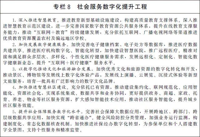 五是持续提升公共服务数字化水平。提高“互联网+政务服务”效能,提升社会服务数字化普惠水平,推动数字城乡融合发展。