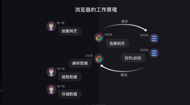 这里的客户端是我们,然后我们打开浏览器搜索关键字,相当于告诉浏览器我需要xx网页,浏览器就去给服务端说,他需要xx网页,服务端收到请求之后就会告诉浏览器网页给你(就像打招呼,同事给你打招呼,你肯定会回应嘛),浏览器会对网页进行解析,转化成客户端看的懂的界面返回出来,然后我们就可以看到查找的网页,然后我们就可以对网页进行数据操作啦。