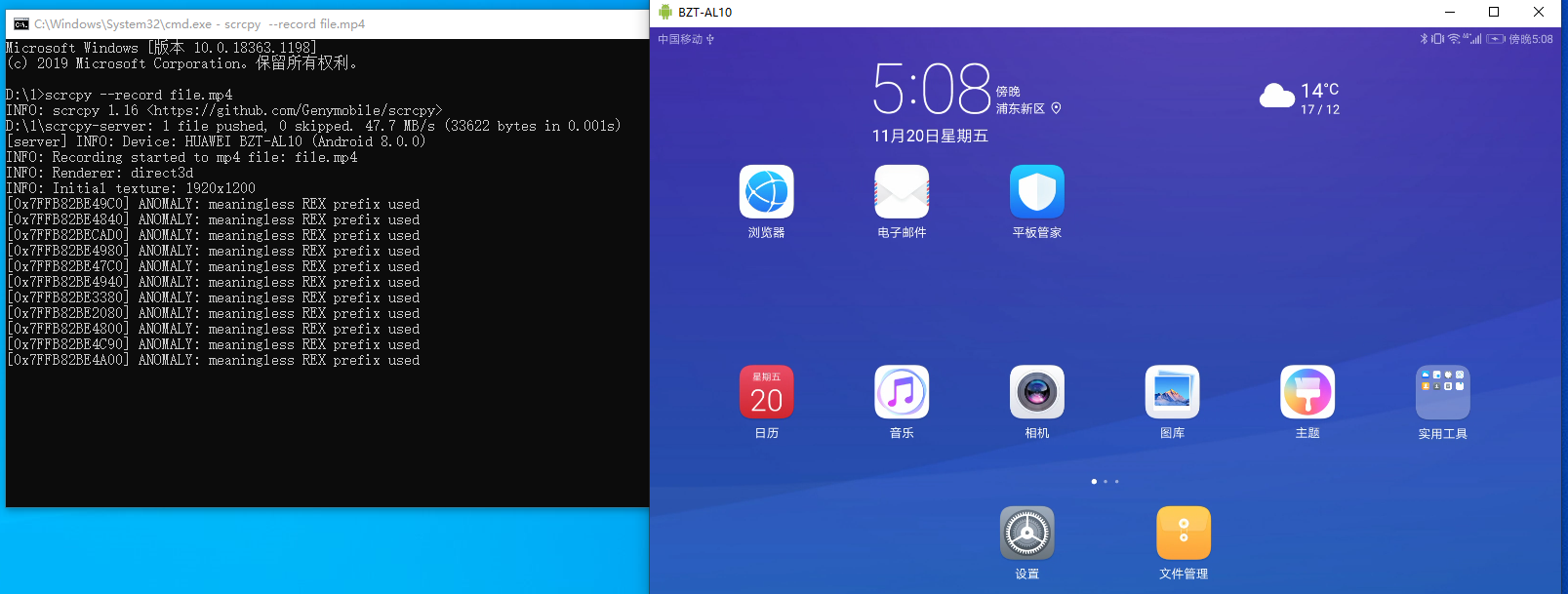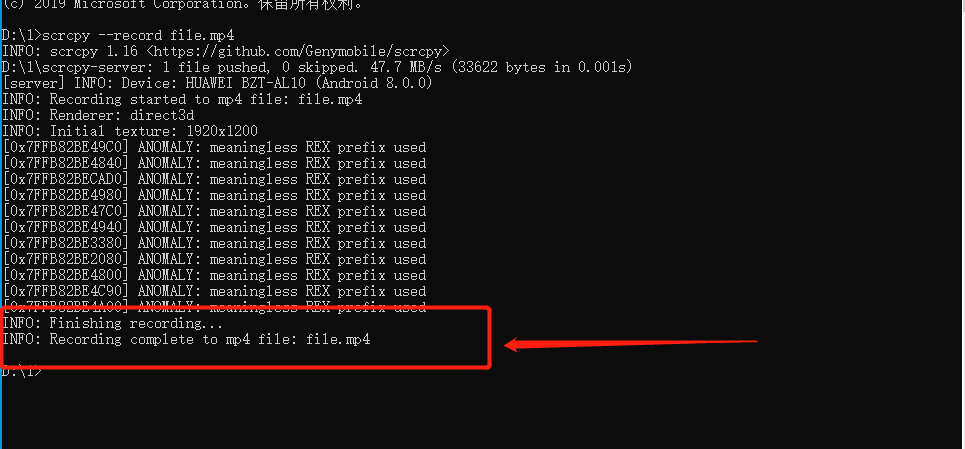 输入命令行scrcpy --record xx.mp4(路径是存放这个mp4 文件的位置,文件名可以任意取,后缀一定要是.mp4)