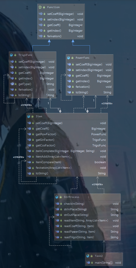 这是我基于上述解题步骤的代码实现。很显然的是,有着第一次作业的影子,但是并不是第一次作业的简单拓展。通过StrProcess类对表达式进行WRONG FORMAT!的判断,以及表达式的解析,建立Item项,同时再对Item项进行函数的读取判断,建立继承于Function类的TrigoFunc和PowerFunc的实例化对象,实现求导输出的功能。但是由于代码实现方法采取是四元组的方法,并不具备后续迭代开发的功能。