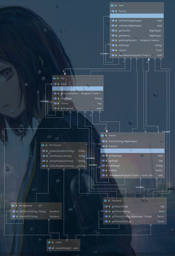 本次作业是一次彻彻底底的重构,通过前文的分析,我在这次作业中采用了Exp,Term,Factor的层次结构。对于每一个exp,它是由若干个Term构成。对于每个Term,其基本形式是a*x**b*sin(...)**c*cos(...)**d*(...)*....。显然,对于每一项可以定义其系数,以及幂函数的指数,且保存三角因子、表达式因子的形式,生成子类Factor。Factor的内容亦是一个表达式。这样,我们得到了一个由这三个类构成的层次结构。剩下的,就是对每一项的求导、优化、输出。