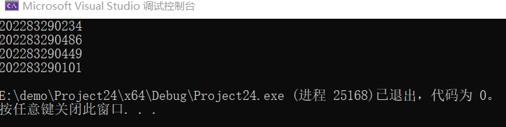 #include<stdio.h> #include<stdlib.h> #include<time.h> #define N 5 int main() { int number; int i; srand(time(0)); for(i = 1; i < N; i++) { number = rand() % 500 + 1; printf("20228329%04d\n", number); } return 0; }
