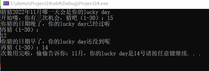 #include<stdio.h> #include<stdlib.h> #include<time.h> #define N 3 int main() { int i, x, j; printf("猜猜2022年11月哪一天会是你的lucky day\n"); printf("开始喽,你有三次机会,猜吧(1-30):"); scanf_s("%d", &x); srand(time(0)); j = rand() % 30 + 1; for (i = 1; i < 3; i++) { if (x == j) { printf("哇,猜中了:-)"); break; } else if (x < j) { printf("你猜的日期早了,你的lucky day还没到呢\n"); printf("再猜(1-30):"); scanf_s("%d", &x); continue; } else if (x > j) { printf("你猜的日期晚了,你的lucky day已经过啦\n"); printf("再猜(1-30):"); scanf_s("%d", &x); continue; } } if (i == 3) printf("次数用完啦,偷偷告诉你:11月,你的lucky day是%d号", j); system("pause"); return 0; }