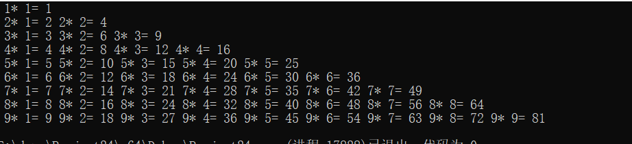 #include<stdio.h> int main() { int i, j; for (i = 1; i <= 9; i++) { for (j = 1; j <= i; j++) { printf("% d*% d=% 2d", i, j, i * j); } printf("\n"); } return 0; }
