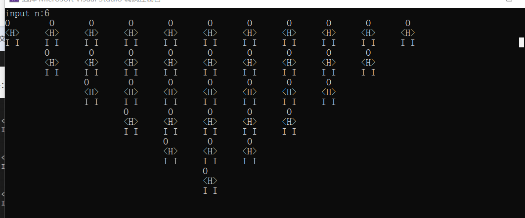 #include<stdio.h> #include<stdlib.h> int main() { int i, x, y, n; printf("input n:"); scanf_s("%d", &n); for (i = 0; i <= n; ++i) { for (y = 0; y < i; y++)printf("\t"); for (x = 0; x <(n-i)*2 - 1; x++) printf("O \t "); printf("\n"); for(y=0;y<i;++y)printf("\t"); for (x = 0; x < (n - i) * 2 - 1; ++x) printf("<H>\t"); printf("\n"); for(y=0;y<i;++y)printf("\t"); for (x = 0; x < (n - i) * 2 - 1; x++)printf("I I\t"); printf("\n"); } return 0; }