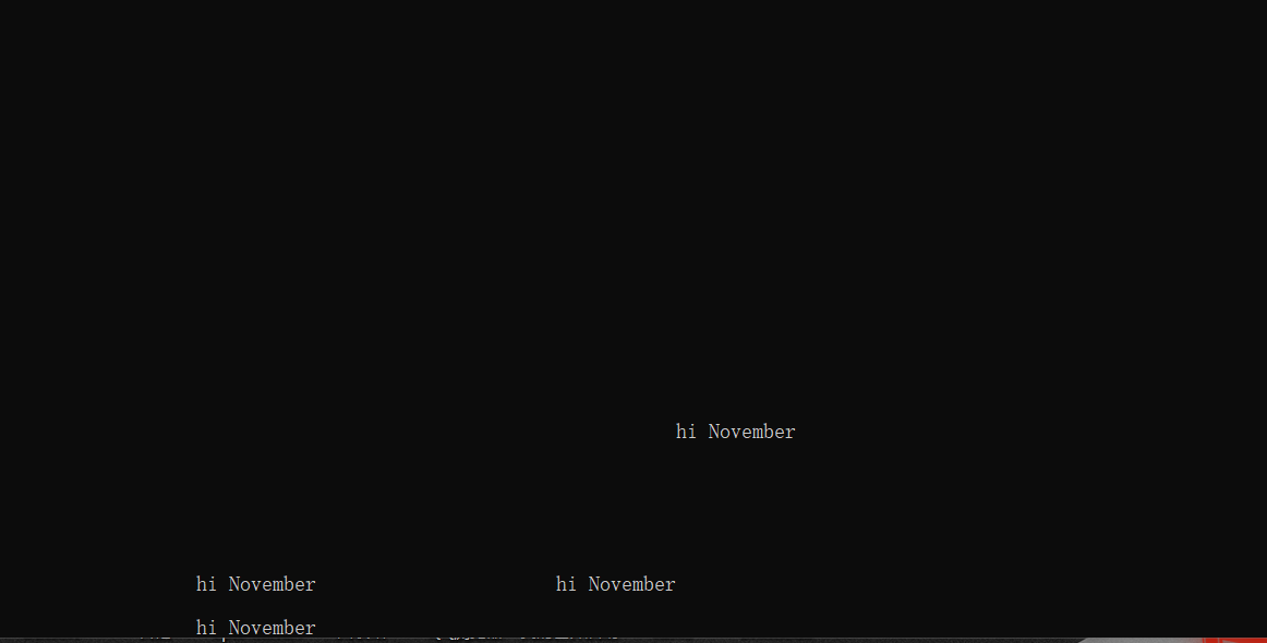#include<stdio.h> #include<stdlib.h> #include<time.h> #include<windows.h> #define N 80 void print_text(int line,int col,char text[]); void pirnt_spaces(int n); void print_blank_lines(int n); int main() { int line,col,i; char text[N]="hi November"; srand(time(0)); for(i=1;i<=10;i++) { line=rand()%25; col=rand()%80; print_text(line,col,text); Sleep(1000); } return 0; } void print_spaces(int n) { int i; for(i=1;i<=n;++i) printf(" "); } void print_blank_lines(int n){ int i; for(i=1;i<=n;++i) printf("\n"); } void print_text(int line,int col,char text[]){ print_blank_lines(line-1); print_spaces(col-1); printf("%s",text); }