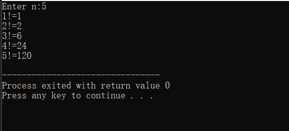 #include<stdio.h> long long fac(int n); int main(){ int i,n; printf("Enter n:"); scanf("%d",&n); for(i=1;i<=n;i++) printf("%d!=%lld\n",i,fac(i)); return 0; } long long fac(int n) { static long long p=1; p=p*n; return p; }
