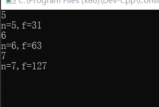 #include<stdio.h> long long func(int n); int main() { int n; long long f; while(scanf("%d",&n)!=EOF){ f=func(n); printf("n=%d,f=%lld\n",n,f); } return 0; } long long func(int n){ long long f; if(n==0) f=0; else f=2*func(n-1)+1 ; return f; }
