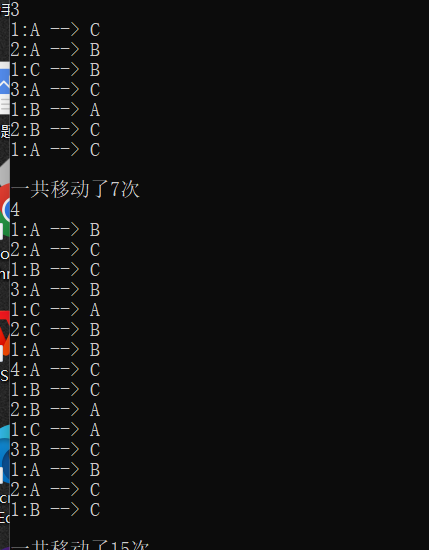 #include <stdio.h> #include <stdlib.h> void hanoi(int n,char from,char temp,char to); void moveplate(int n,char from,char to); int count = 0; int main () { int n; while(scanf("%d",&n) != EOF) { hanoi(n,'A','B','C'); printf("\n一共移动了%d次\n",count); count = 0; } return 0; } void hanoi(int n,char from,char temp,char to) { if(n == 1) moveplate(n,from,to); else { hanoi(n-1,from,to,temp); moveplate(n,from,to); hanoi(n-1,temp,from,to); } } void moveplate(int n,char from,char to) { printf("%u:%c --> %c\n",n,from,to); count++; }