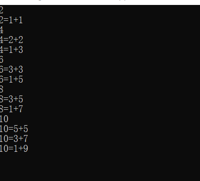 #include<stdio.h> #include<math.h> int is_prime(int n); int main() { int i,j,n,s; while(scanf("%d",&i)!=EOF){ n=i/2; s=i/2; for(;n>0,s<i;n--,s++){ if(is_prime(n)&&is_prime(s)) printf("%d=%d+%d\n",i,n,s) ; } } } int is_prime(int n){ int i; for(i=2;i<=sqrt(n);i++) { if(n%i==0) return 0; else return 1; } }