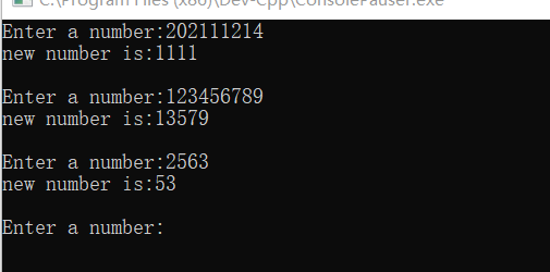 #include<stdio.h> long func(long s); int main(){ long s,t; printf("Enter a number:"); while(scanf("%ld",&s)!=EOF){ t=func(s); printf("new number is:%ld\n\n",t); printf("Enter a number:"); } return 0; } long func(long s){ int i; int j=0; int t=0; int count[100]; while(s!=0){ i=s%10; s=s/10; if(i%2!=0) { count[j]=i; j++; } } for(int k=j-1;k>=0;k--){ t=t*10+count[k]; } return t; }
